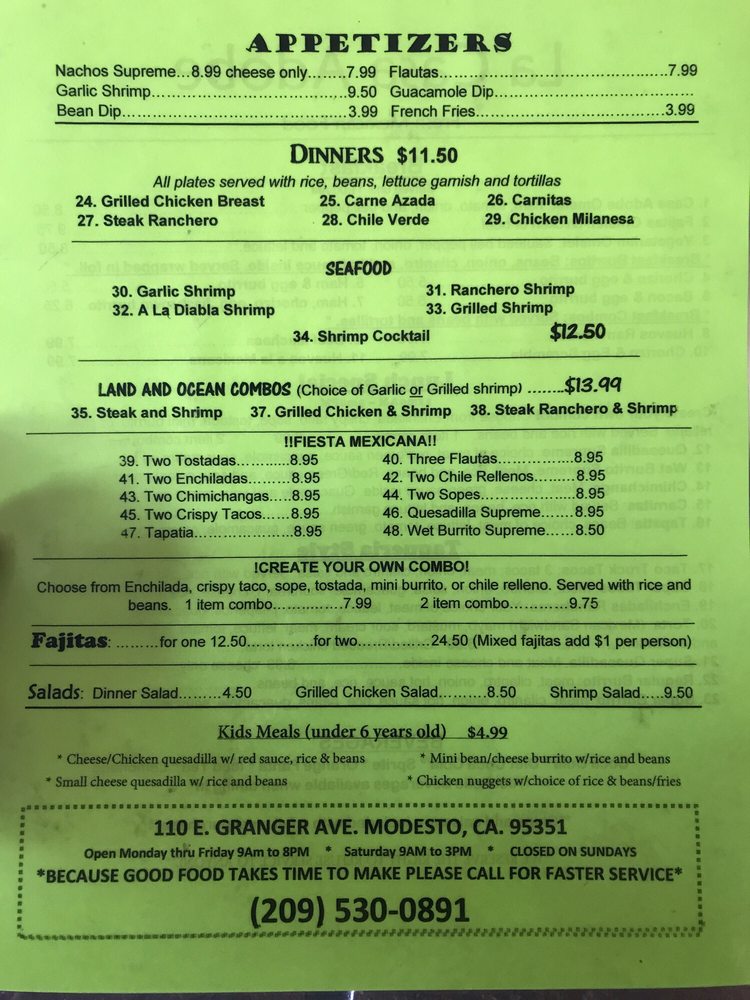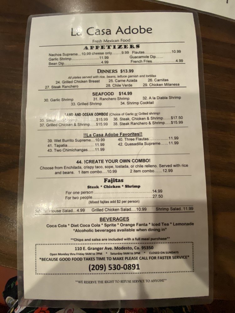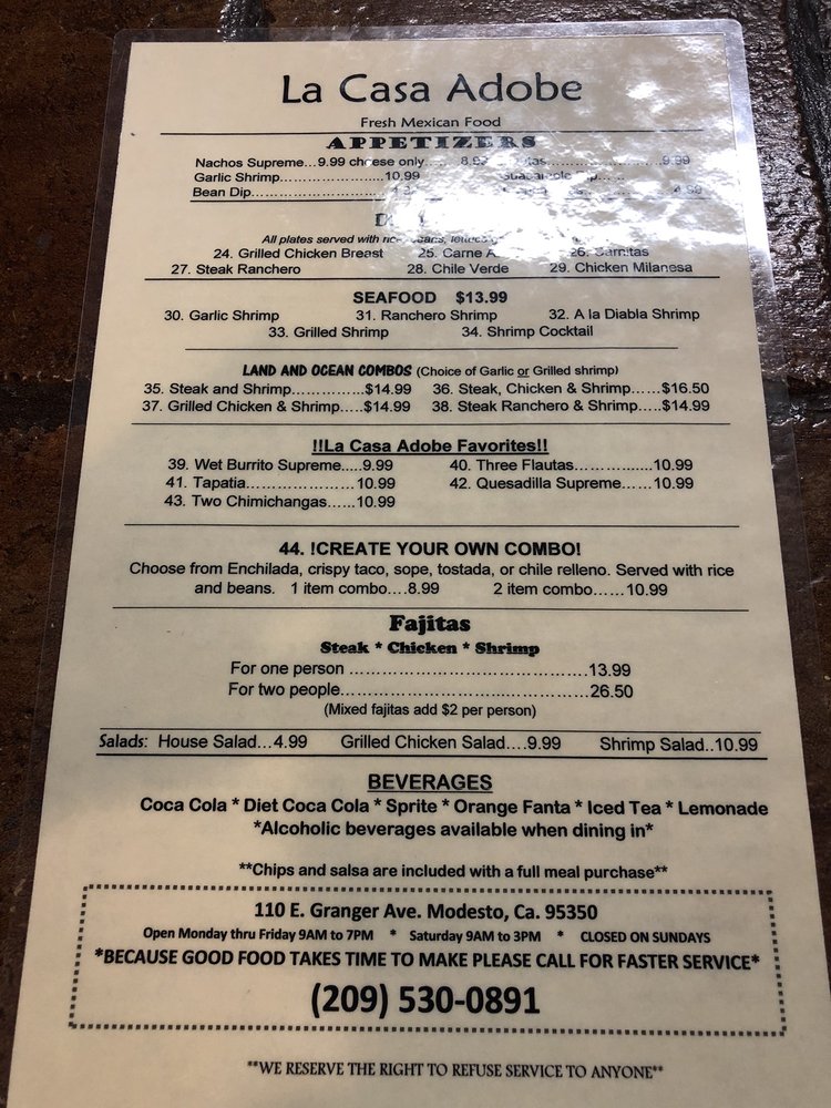 Welcome to LA CASA ADOBE, your destination for authentic Mexican cuisine located at 110 E Granger Ave, Modesto, CA. The vibrant menu offers a delightful journey through traditional flavors, starting with appetizers like Nachos Supreme and Garlic Shrimp Flautas. For breakfast lovers, the Beef Machaca and Chorizo Egg Scramble are must-tries.